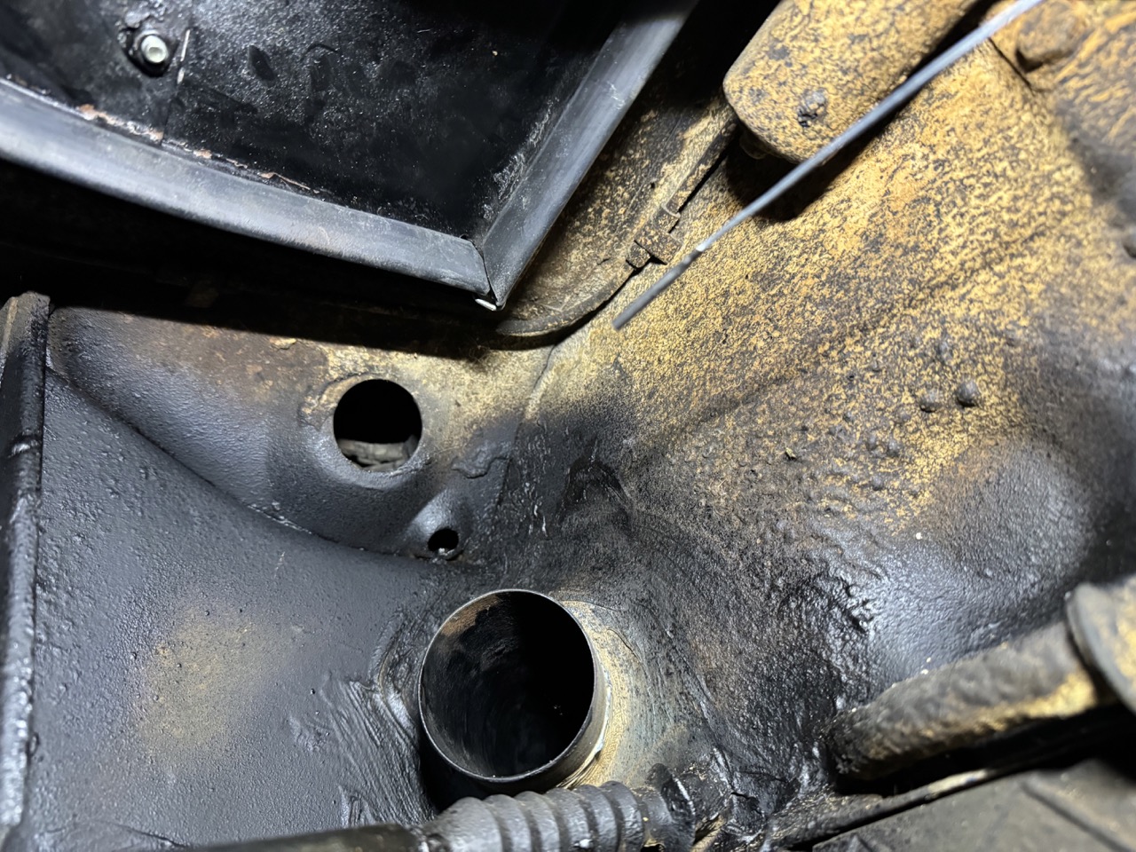 What is it for? And, does anyone sell a plug to fill it? I don't remember a similar hole on my old '73 1.7. And, I don't want to leave such a big hole open, so I need a plug -- I can make one if needed, but I'd rather get the correct part if possible. Here's a pic from the underside. The hole in question is the top-most, just under the rubber engine gasket. |