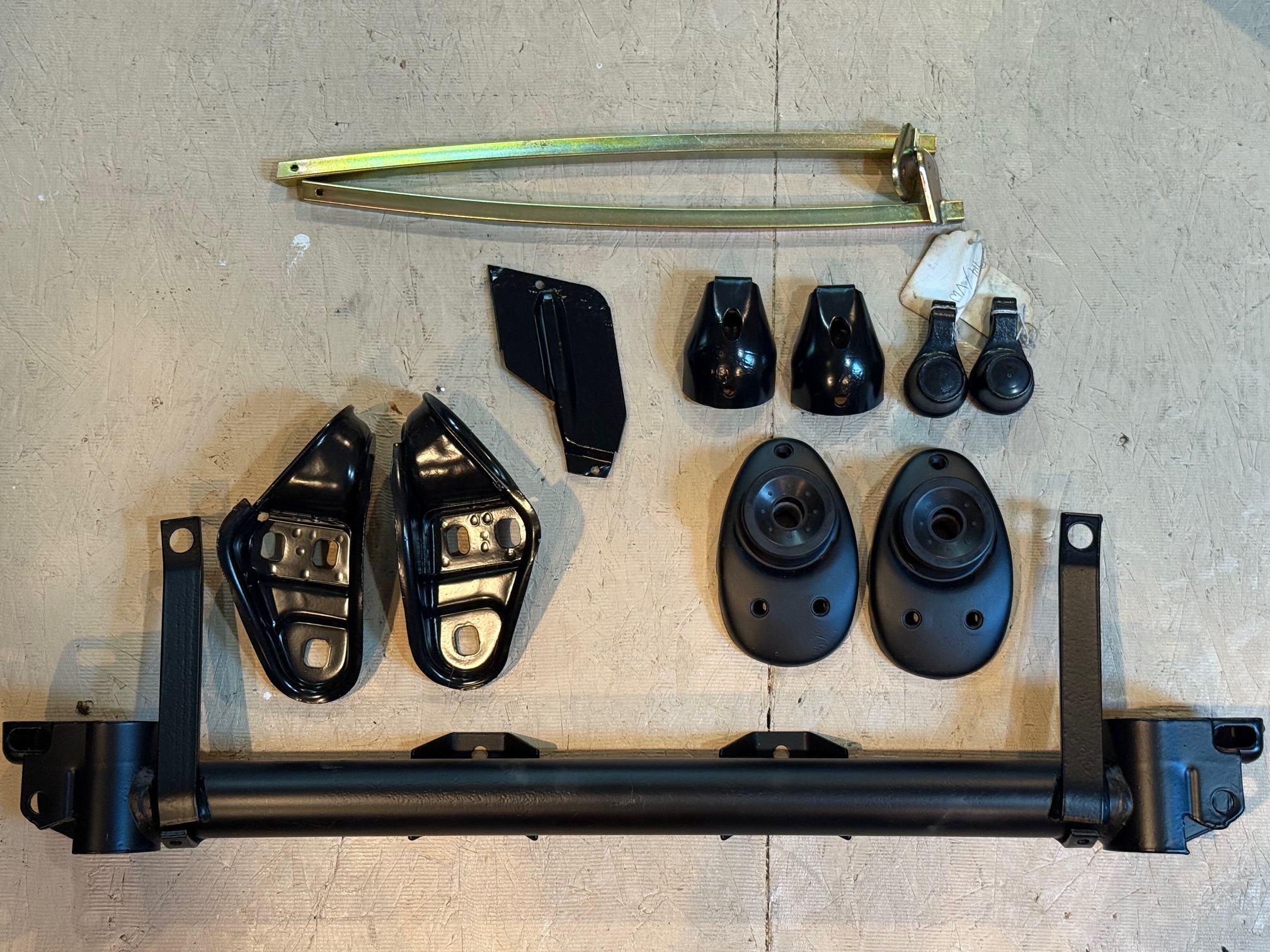 Restored 911T steel crossmember. Same as 914-6 other than the part number. Powder coated satin black. $150 + ship Powder coated front strut mounts with new two piece bushings. Satin black. $75/pair + ship Rear trailing arm adjustment plates. Powder coated semi gloss. $50/pair + ship. Plated window guides for mid and late model doors (scissor type mech) $50/pair + ship. E-brake cable cover. Had some pitting in the metal. Blasted and powder coated. Used on mid and later cars. $20 + ship A-arm protective bracket. Powder coated. $25/pair + ship. PM me or email - Mark@MarkEpstein.net to purchase. Hey Mark I'll take a pair of your window guide posts to Nashville 37216 |