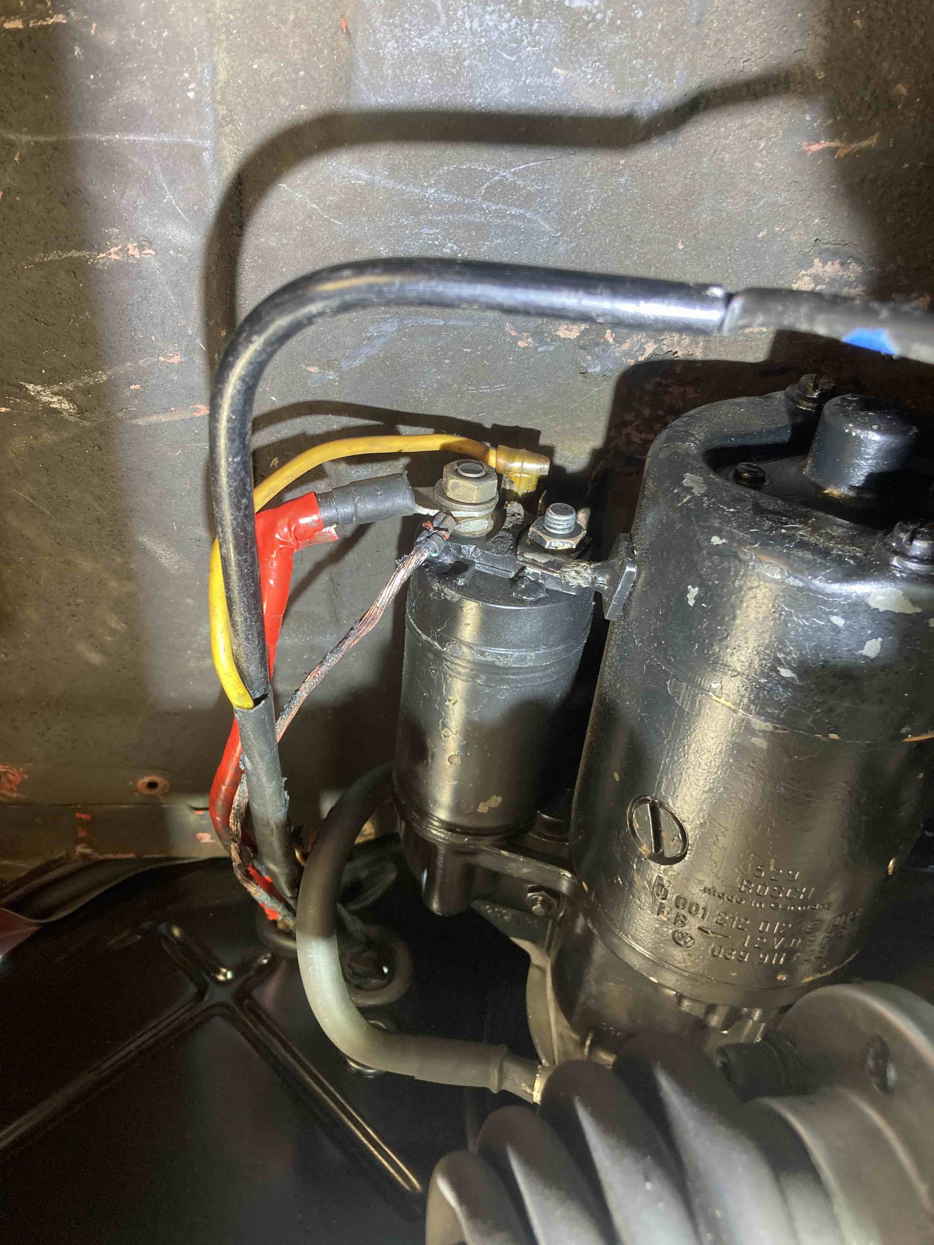 I need to get a bung welded in to it so I could finish the hookup of my AFR and start tuning my MPS . I first put my rear sway bar back in with new bushings as this requires the muffler to be removed for access. I installed the Bursch and started the car , Muffler sounded a lot better. than my original 914 muffler that I found holes in. Decided to take my buddy for a drive to show him how great the car sounded and ran . Made it to the corner and then proceeded down the street and when shifting from 2-3rd I heard some type of noise( maybe a crack/pop/snap ) and noticed the car losing power ,glanced up in the rear view mirror to see if anyone was behind me and a ton of smoke was coming out of the engine compartment .Immediately shut of the key and put in neutral so I could coast into the tract next to me in a panic . I thought I was going to lose my car to a fire but luckily it was an electrical fire instead of gas , what a lot of smoke though . Pushed the car back home and a quick investigation revealed the 10 ga wire in the alternator wiring harness completely melted down revealing bare copper wire that goes from the alternator to the + starter post where the battery cable attaches for charging . Any ideas or suggestions would be appreciated . Why did this happen? Should I replace the alternator ? What about the starter? The voltage regulator? I see that 914Rubber sells a wiring harness, the three pin plug that goes between the alternator and Voltage regulator did not get much damage and looks ok to me . I can order new charger wire and repair the harness. Also thinking of adding a breaker , I attached a photo of what I am considering but before purchase I have learned to ask the forum first . I must say it does not look easy to get to the alternator ,I installed it when motor was out of car . Do I need to remove the motor for access? The way it burned it seem likely a short to ground occurred but hard to tell after the fact what caused this . I think my car is possessed , can't believe this just happened when I was so close. Some photos : ![]() ![]() ![]() ![]() ![]() |
