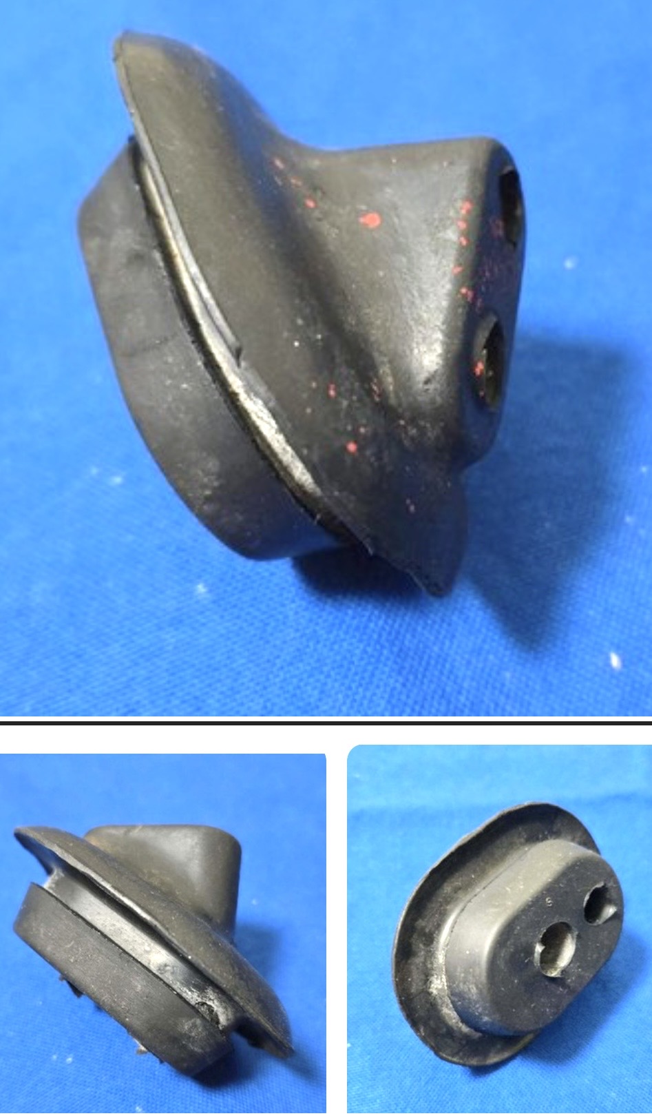 Last a updated 3 hole vers was installed in late 75-76 cars The 2 hole vers presumably has asymmetric sized holes to fit the metal tips on the lines. The late version has 2 symmetrical line holes + the 3rd is a small one for the charcoal evap system that was now the tunnel. |