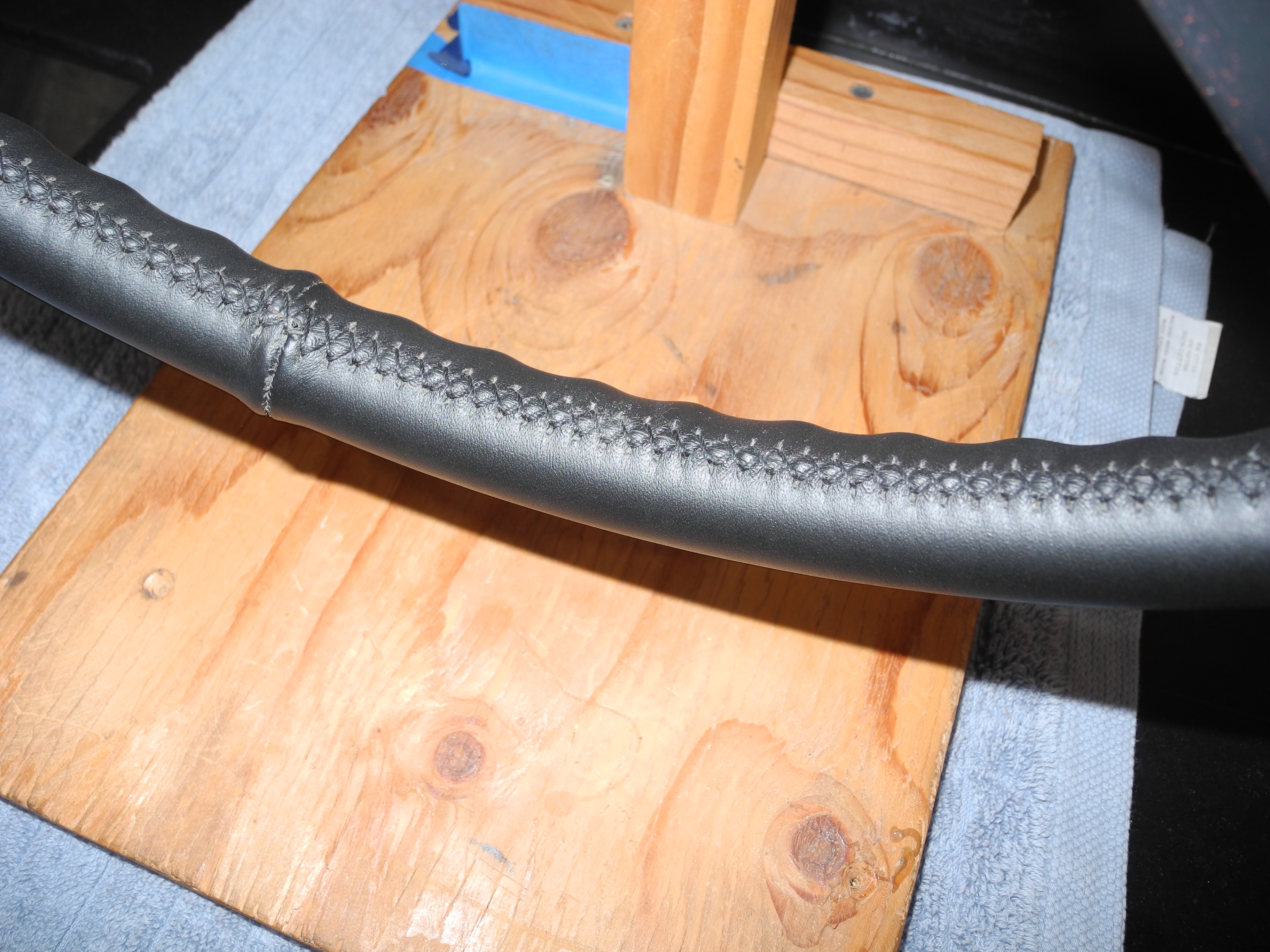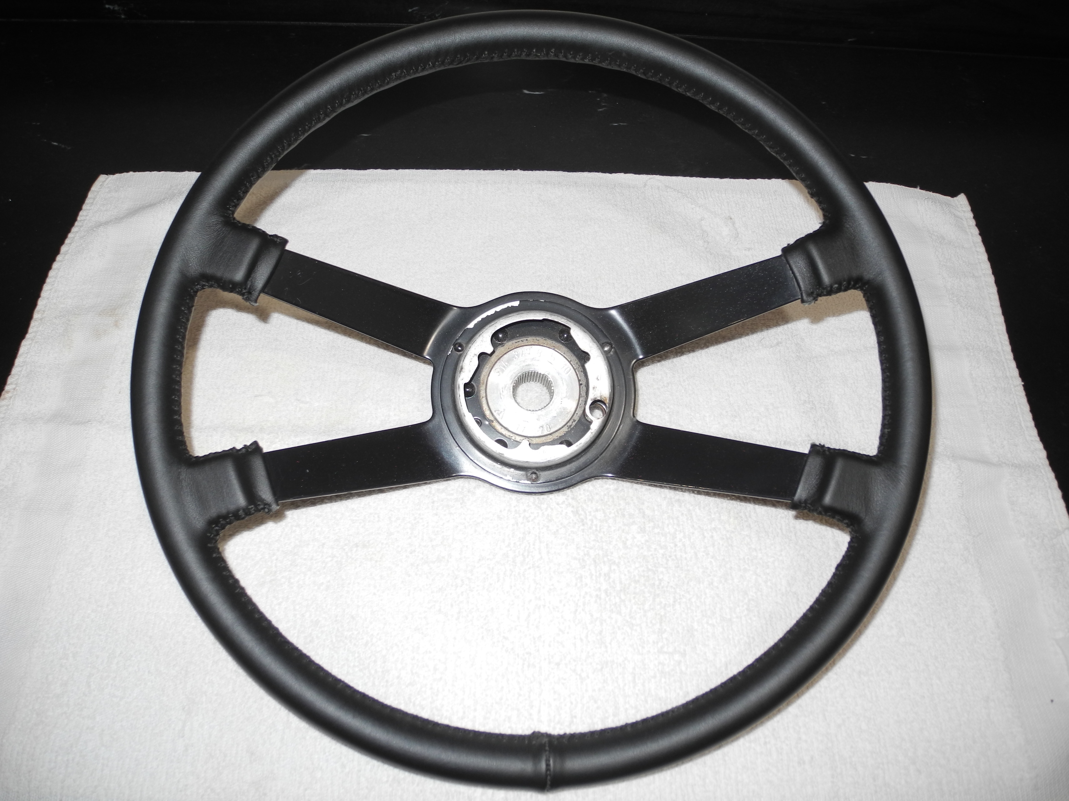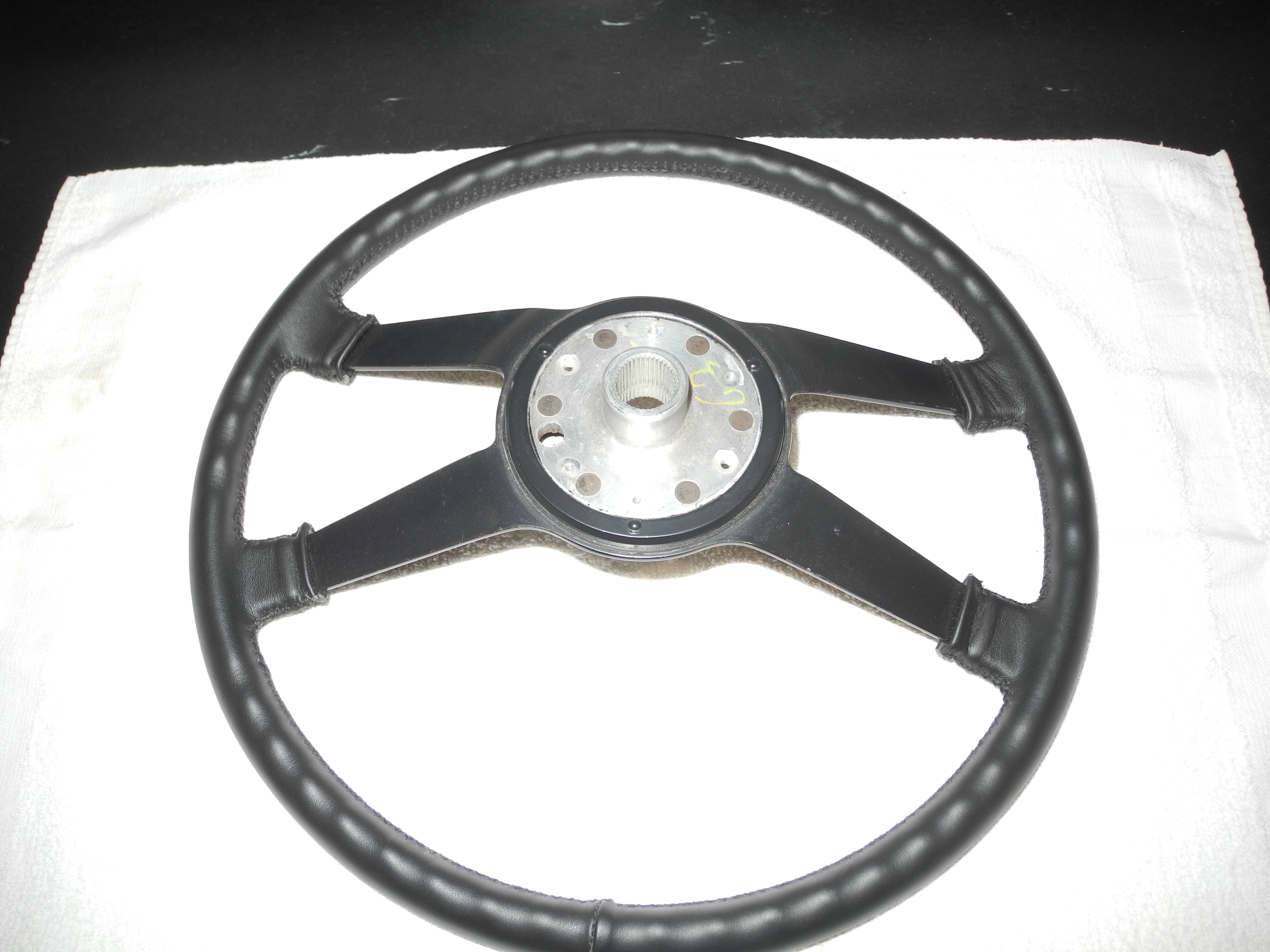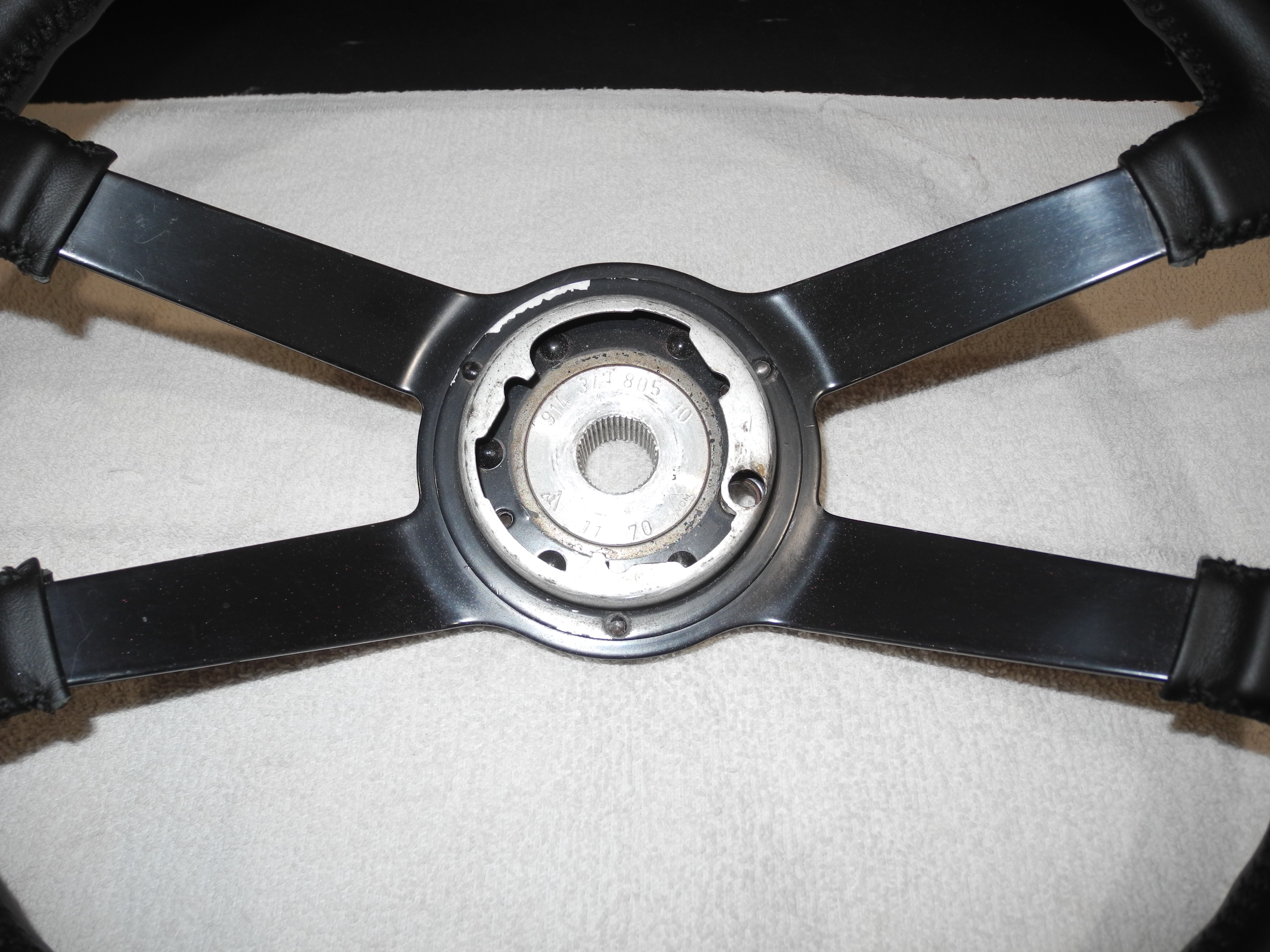 Just a regular hard rim 914 wheel. I recovered it in leather from Alan Gunn. No extra padding on this one. I think it came out great and feels good too. Paint on the spokes is original and looks perfect. No horn pad or cancelling ring, you will have to use yours or source. I will take your 380 or 400mm flat hub wheel as a core for $150 (you pay shipping). $750 shipped in the US (others we can discuss) Dean |