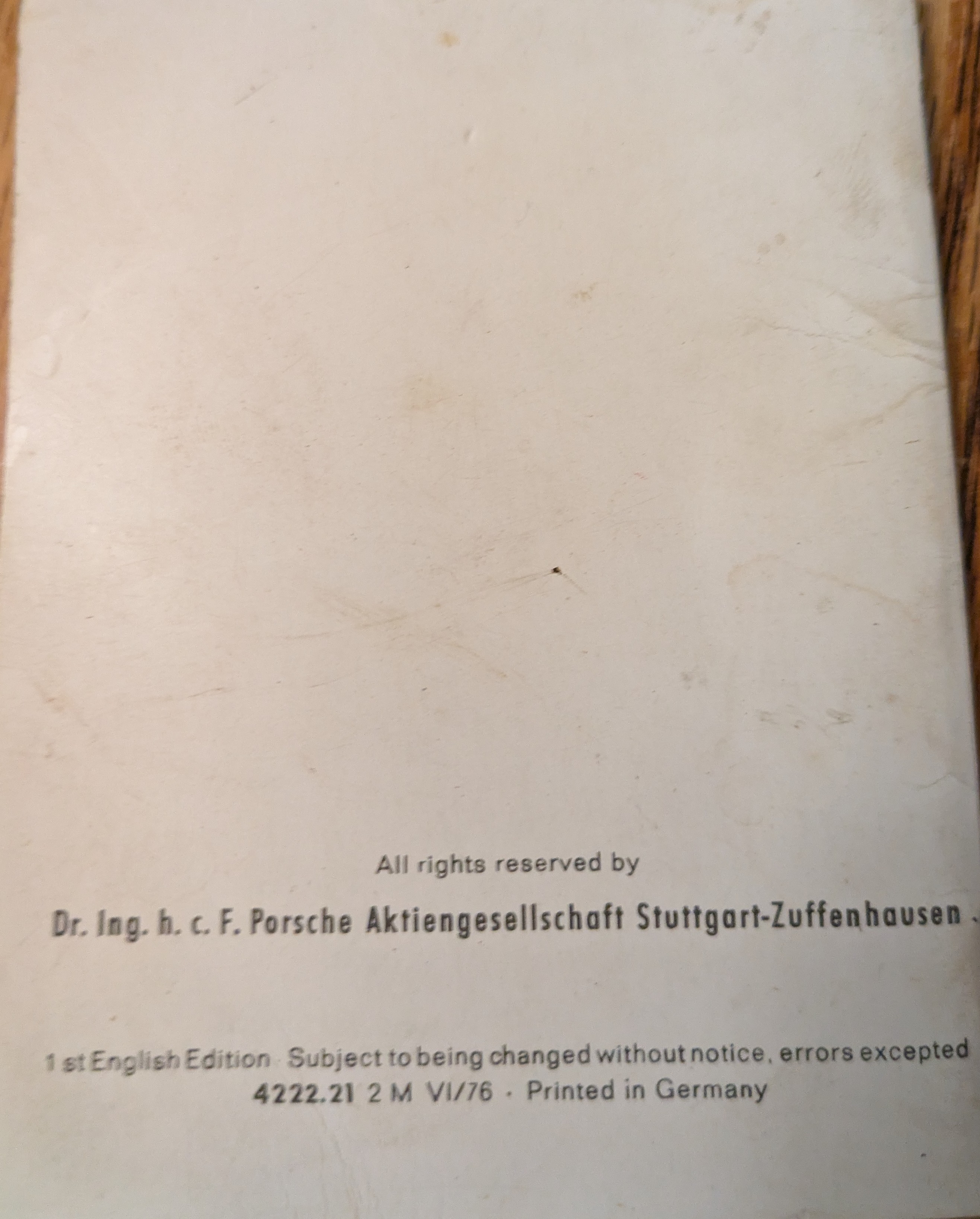 A friend handed this to me today.... These are super handy and have details that are hard to locate elsewhere. Porsche made them for pretty much every model. Except 914-6, which you have to get the 914 and early 911 versions for full coverage. They are available as new reprints from your favorite vendor. Nice to know they are still available. I will tuck this little gem into my faux leather manual sleave... |