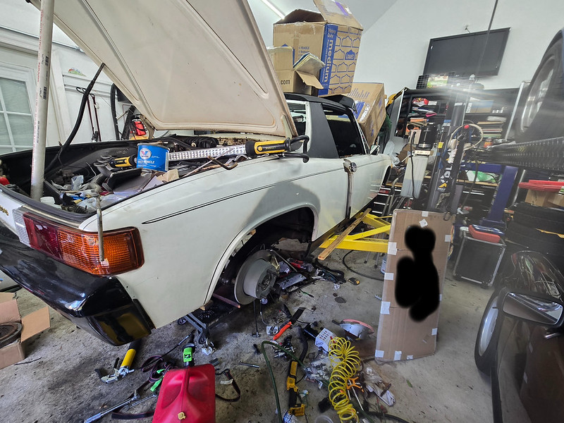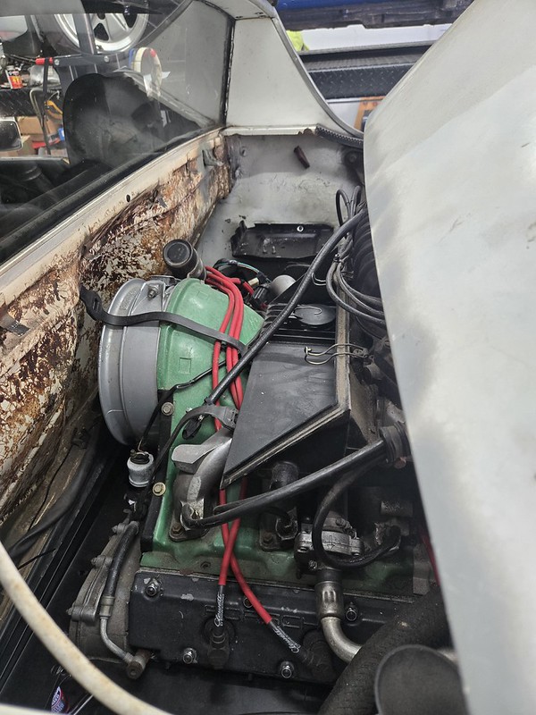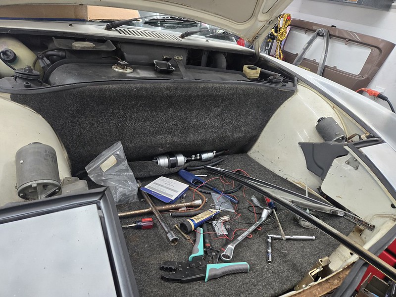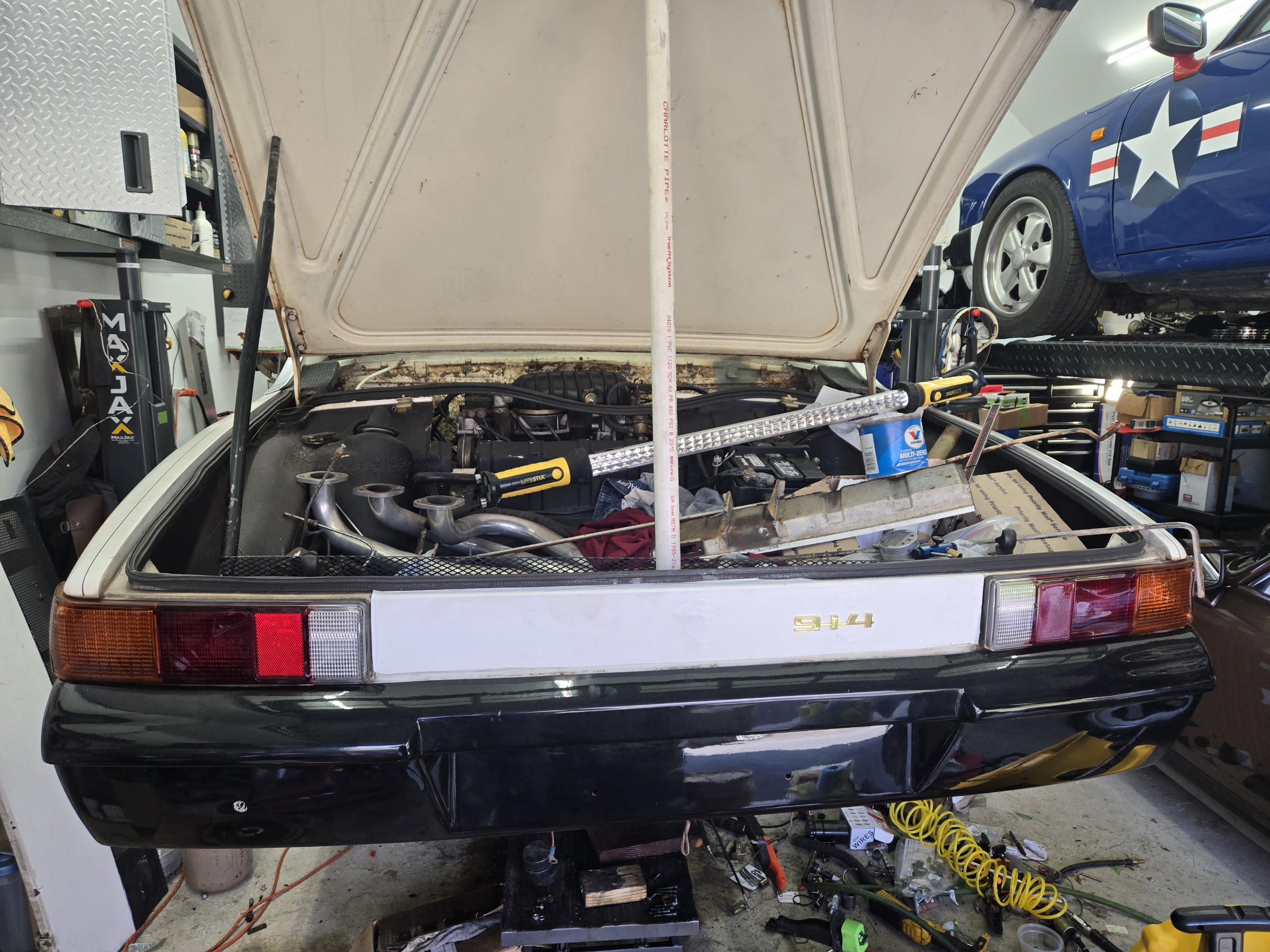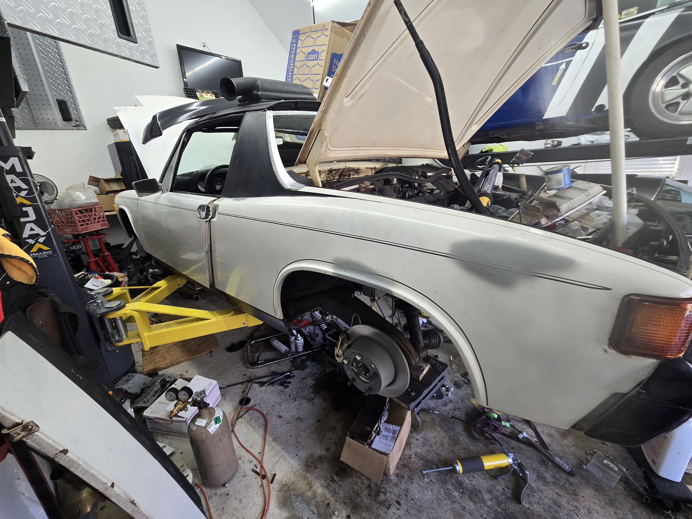 I picked up this running driving 1974 car earlier this year from another long time member. Solid for the most part and had rust repair done by black forest racing. Once I got it home the 1.7 dropped a valve and warranted a rebuild. I decided to do a conversion since I had already done one in the past and had a running 3.0 on a test stand. I started doing the 5 lug conversion (SC/Carrera front struts). It and the car are about 80% complete. PMB refurbished brake calipers all around. New rotors and pads. New brake lines the firewall back and New rubber lines up front. Stainless steel fuel lines installed and a brand new fuel pump. I welded the factory maddog 6 mount. Installed Ben's oil tank. I hit a snag once I installed the 3.0 engine. I wanted to keep the CIS. In order to do so the trunk wall was cut. After installing it was clear the trunk, nor the engine lid will close. I dont want to cut either so it's either put carbs or ITBs on or change the CIS to a later 3.2 which will be extensive. This is where the project stalled. I am offering it as a complete package with the running engine OR if you have a 6 with carbs or EFi and want to finish it I can sell just the roller plus trans.