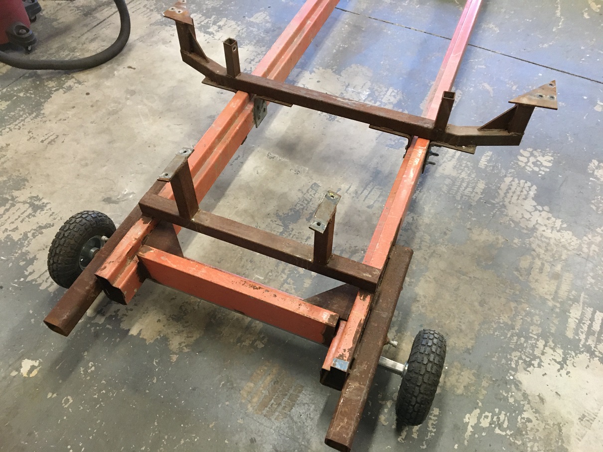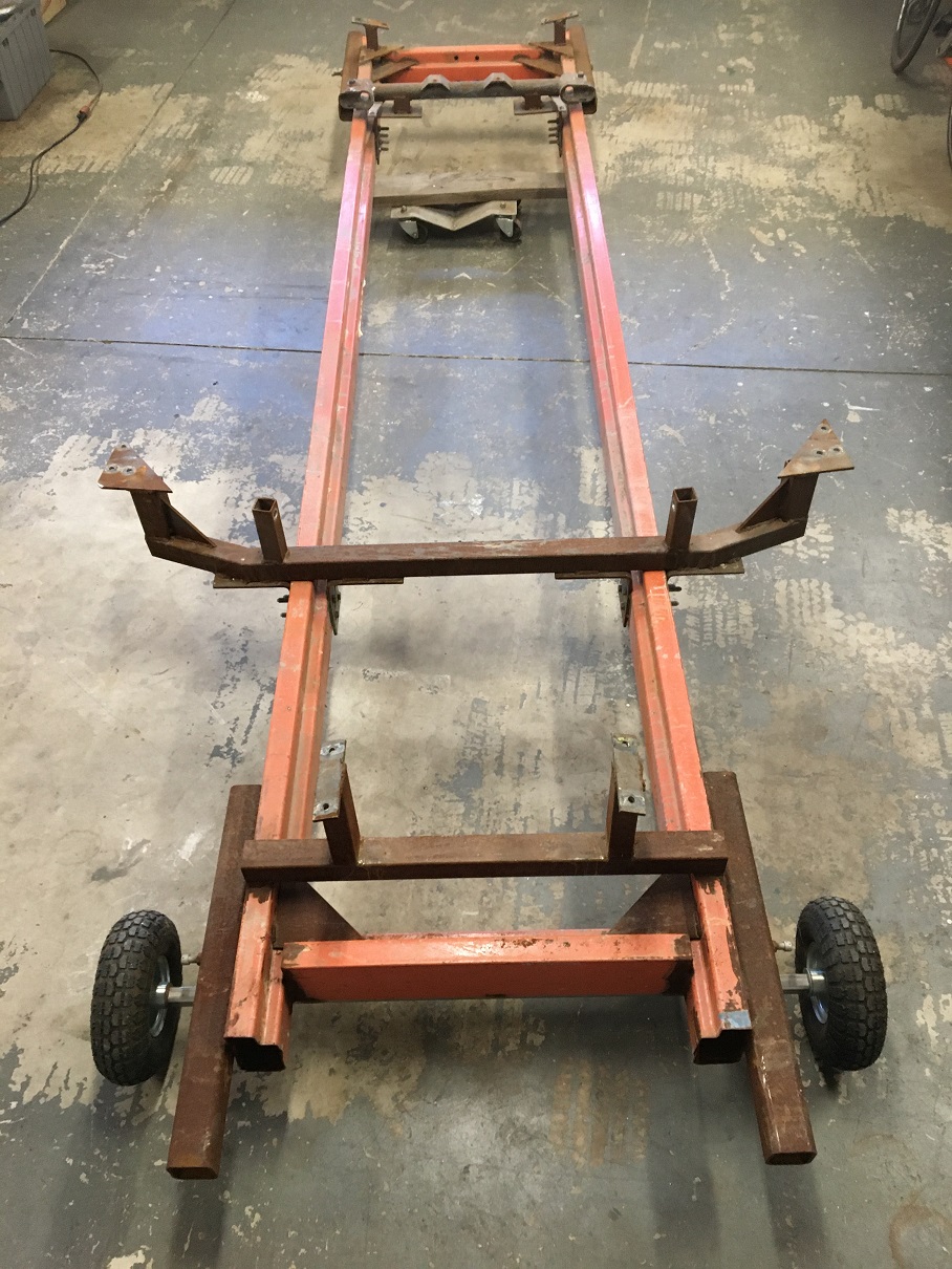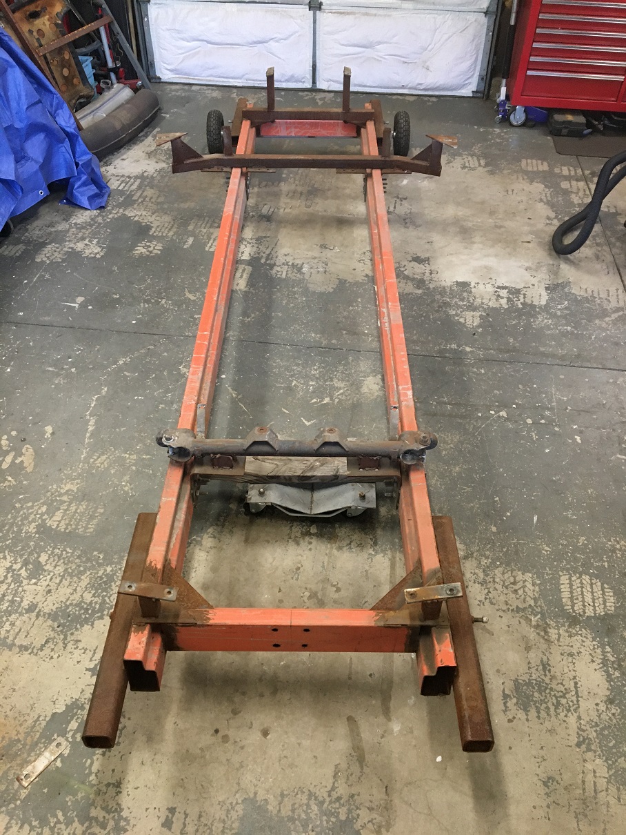 Restoration frame with front suspension lower attachment points, rear suspension lower points, and gearbox tail support anchor points. Made of 5.5" box beams (industrial racking). Equipped with 2" receiver at protruding 6" at each corner so it can be picked up by rotisserie for which it was originally designed to work with. Orange frame 12 feet long, 13 feet overall with the receivers. Does include the mower wheels but not the grey dolly on the front. Come pick it up promptly in Claremont before I cut and recycle it. (IMG:style_emoticons/default/smash.gif) Price: $100 (IMG:style_emoticons/default/cheer.gif) ![]() |