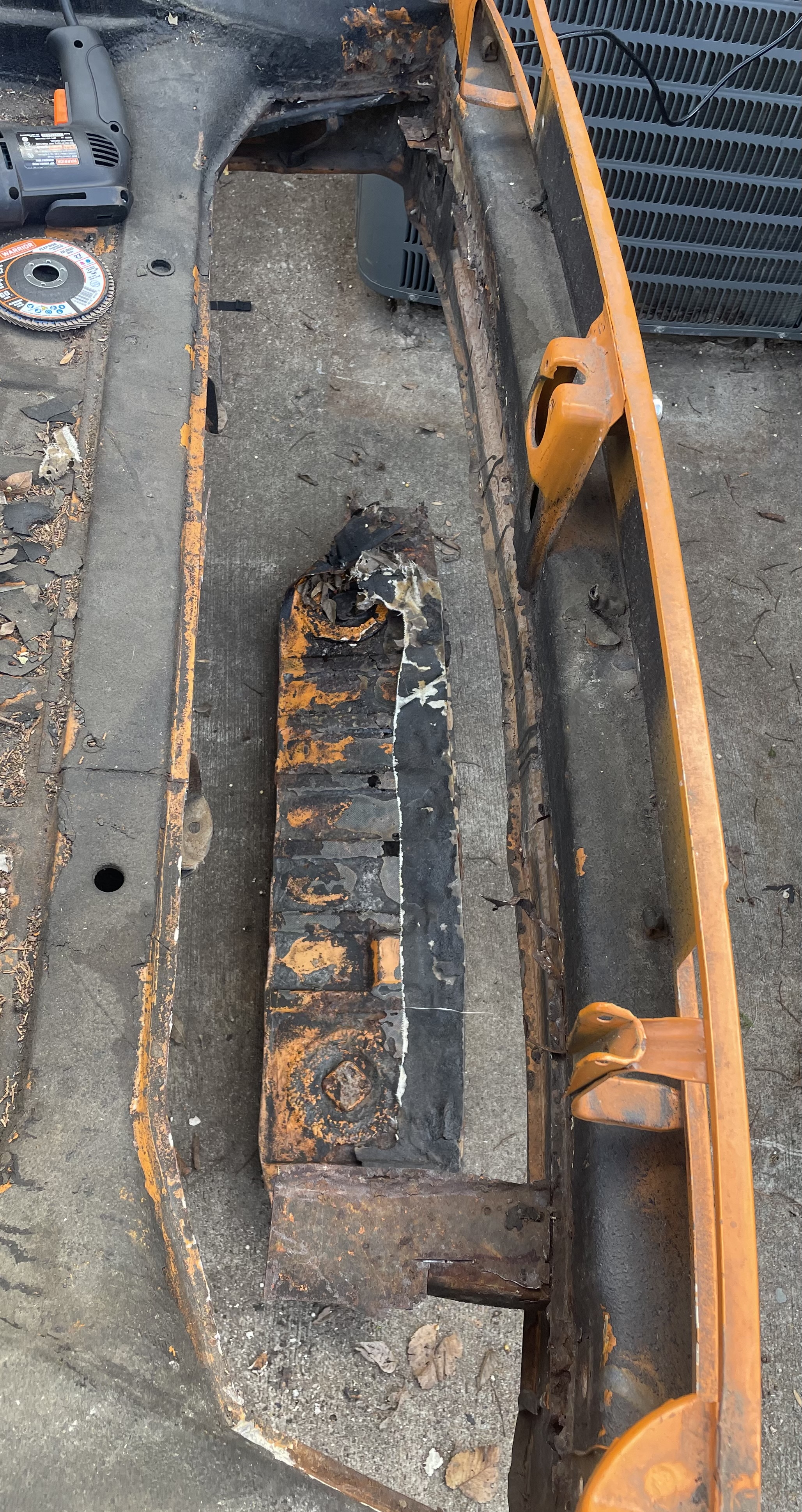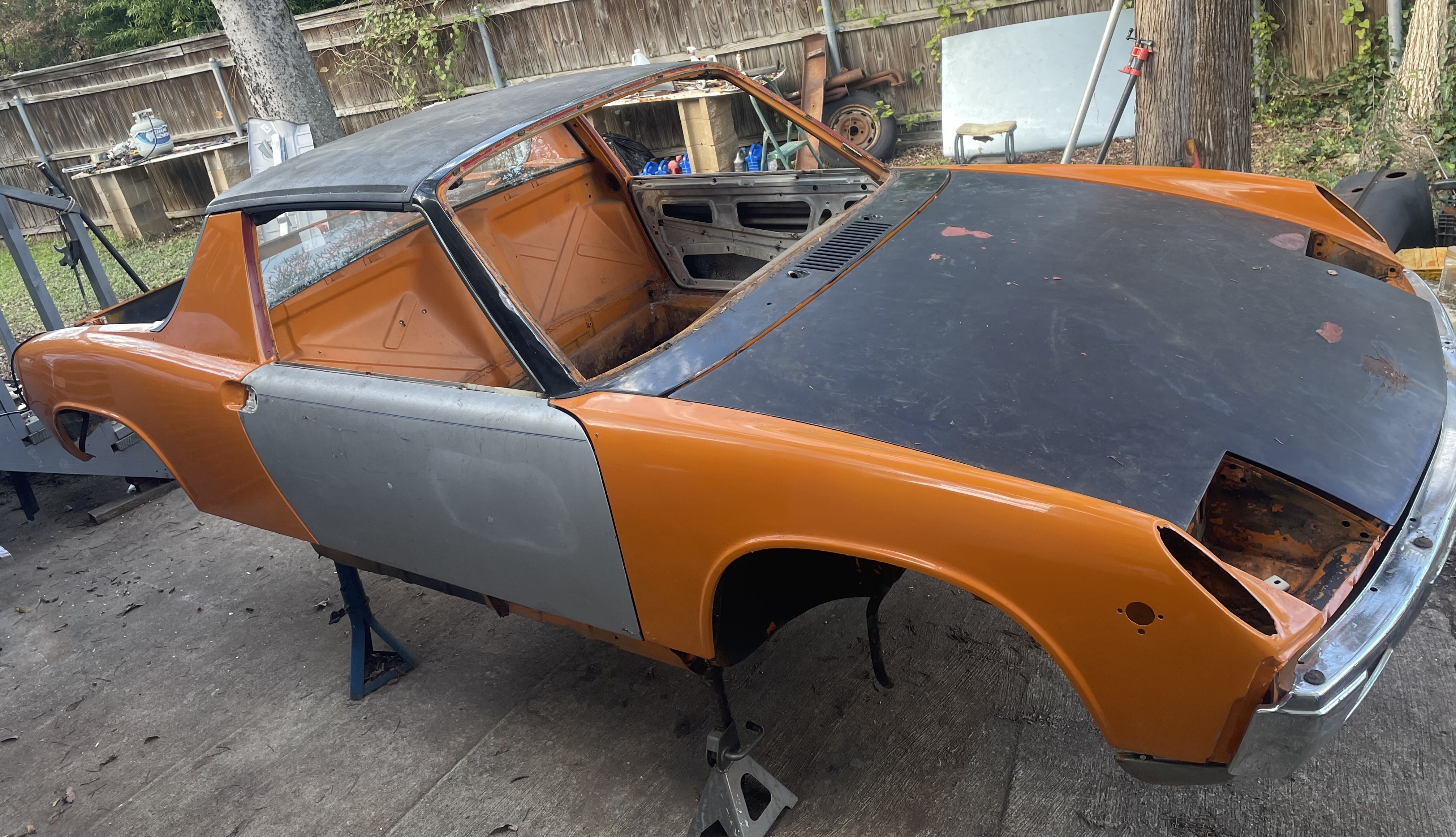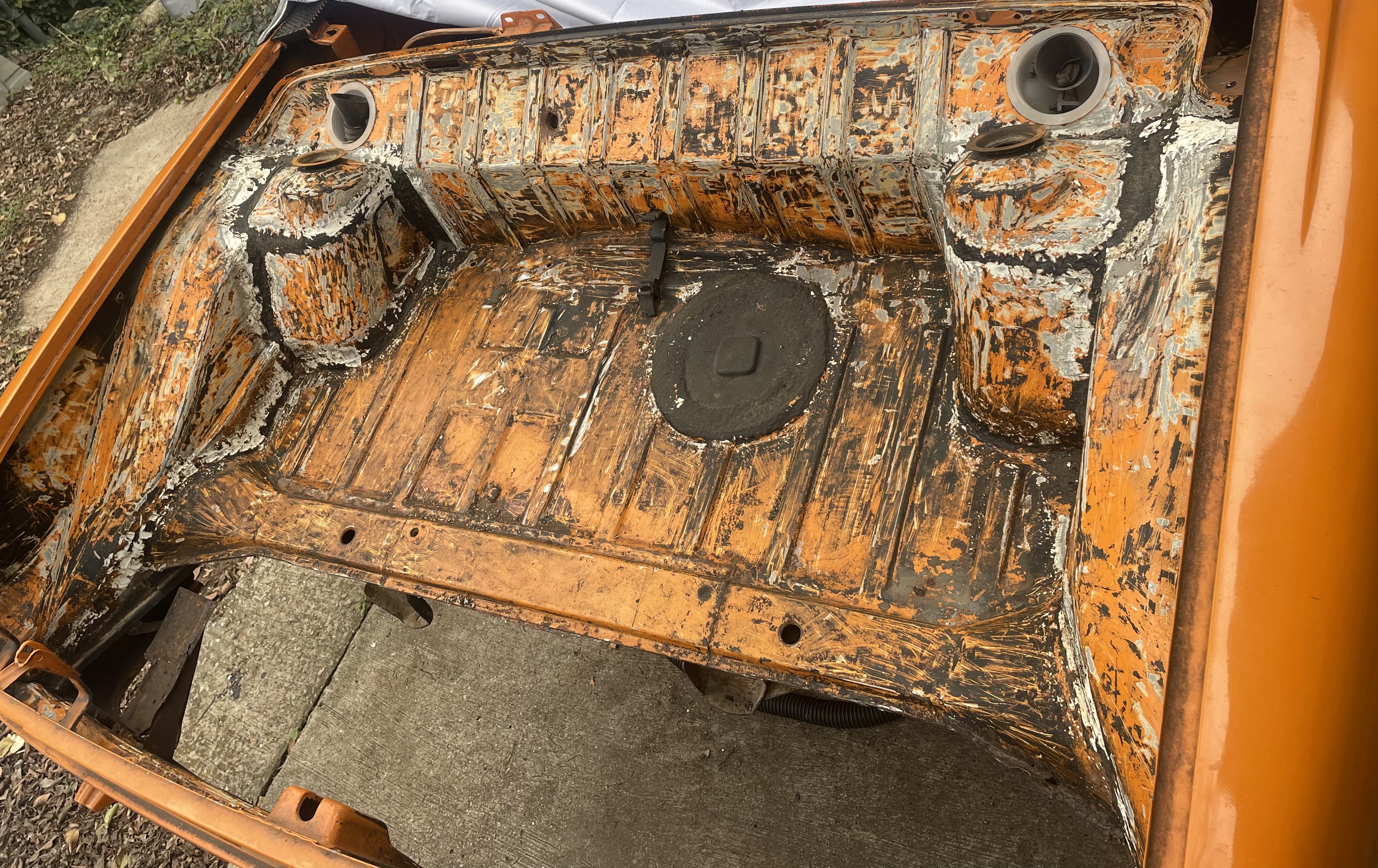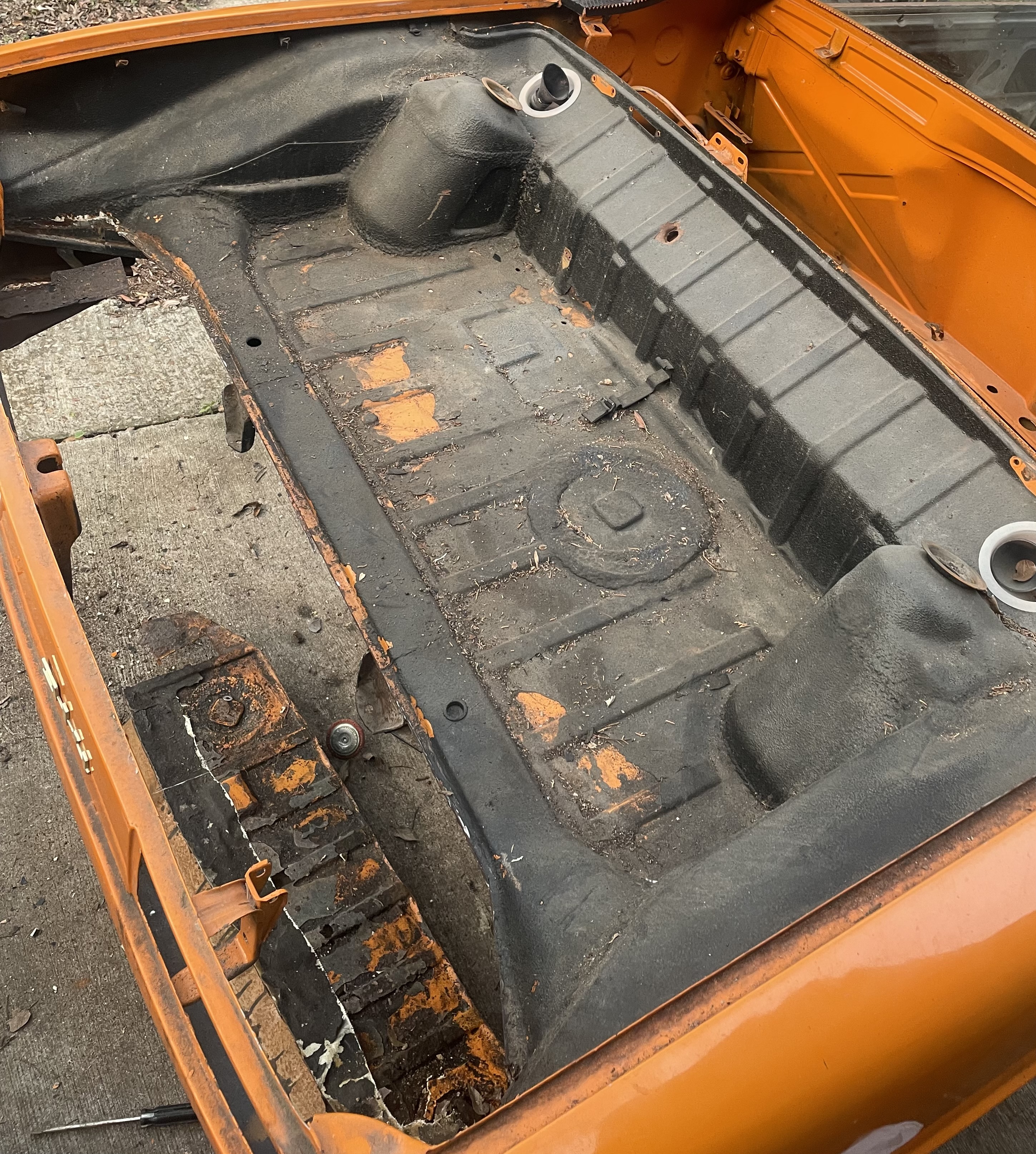 The floors were Swiss cheese (see the before pics) worse than I’ve seen on a car that I’d consider a good rebuild candidate tbh. PO used bondo to fill the holes, I kid you not. The back part of the rear trunk was terrible - had been patched with fiberglass cloth that water had gotten under. Then everything covered in a bedliner product that was only sticking in about 80% of it’s coverage, including wheel wells. The body itself was in pretty good shape.. the shell had even been recently painted (original Signal Orange), but done poorly, there is literally dried clear dripping at the wheel well edges. There are also some bubbles forming in a few spots under the paint that will now need to be addressed. Over the last few years I’ve sourced most of the missing parts (that cheap parts car is paying for itself in this one). I picked up a set of unused floors from a member here a couple years ago too.. as well as ordered other needed sheetmetal items for it. So I’m now ready to start restoration on this one. I like having a thread showing the process and the before/after but admit I’m not always the best at getting it all documented. Here’s the car as it sat a couple weeks ago (with random doors, roof, etc). Attached thumbnail(s) |