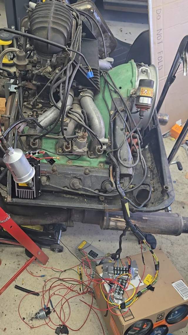 I purchased this engine over 2 years ago with the intention of swapping it into a 914. The conversion stalled. The engine is currently sitting in a 74 914. I ran it on a test stand before installing and can provide a vid. It will come complete with headers/mufflers as shown. The clutch package can be for an early 901 trans or for a 915. I have both in new condition. It has a 123 dizzy currently installed. Clewett plug wires (not shown in pics). Turbo lower valve covers. CIS is for a 78/79 OR 78-83 euro. I can check all numbers of WUR, FD. This setup (big port intake to small port heads) runs fine. I have been running big port on my 82 SC engine for years. Leak down numbers are great so it must have been rebuilt at some time in it's life. Will need to check if I have another oil cooler. I converted the spare i had to a 914-6 setup.
