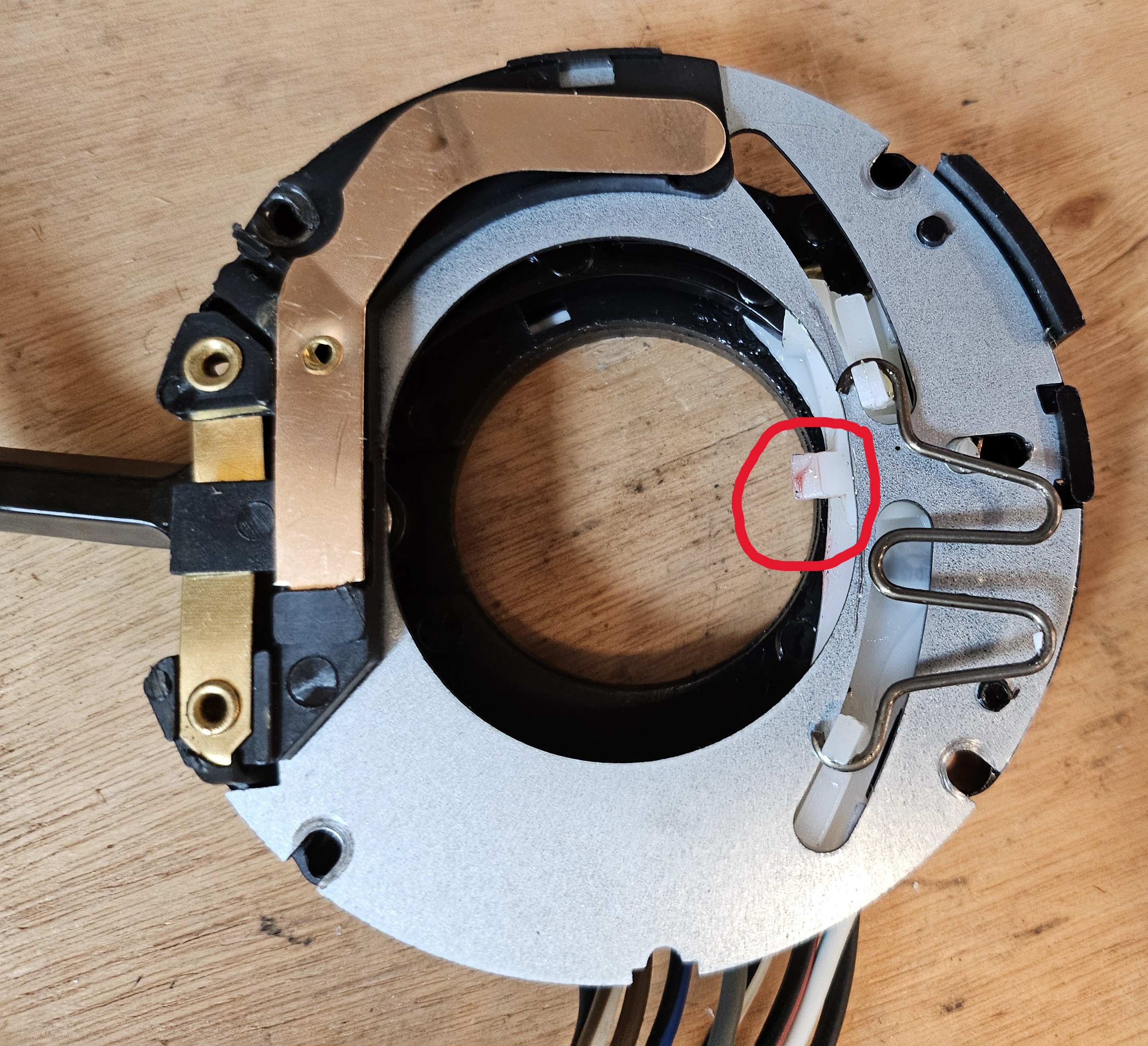 I had the same problem with my car when I first acquired it (in my case, the turn signal would not cancel when turning to the right). The issue was a faulty aftermarket switch where the white plastic tab on the switch that extends out to the center when the turn signal switch is engaged would fall down when the switch was placed in the upper (right) position (see circled area in photo below). This would prevent the 'tang' on the cancel ring from contacting the tab on the switch when the steering wheel spun back counter-clockwise after the turn. I tried applying some grease to the tab mechanism to prevent it from falling down, but that only worked sometimes. Red circle area shows the white tab that extends out when turn signal is engaged. So I purchased a new switch (aftermarket is only option) which did not have the issue noted above, but the tab when pushed by the tang in either direction would not cancel the turn signal switch. I tried canceling the switch manually with the steering wheel removed and found that pushing the tab in the cancel direction took significant pressure to get it to move (I thought it was going to break), but even when moved it would not cancel the switch. It simply appeared that the switch was poorly manufactured. Lubricating the moving parts did not help. I then ordered a used OEM switch from an eBay seller. The turn signal stalk is a bit worn, but the switch works perfectly, and has a much smoother feel than the aftermarket part. Oh, and the male spade connectors on both aftermarket switches were made from a very thin metal which resulted in a very loose fit with the female connection under the steering column (the connector had to be taped together to prevent them from separating). The connectors on the OEM switch fit snugly as they should. Hope this helps. |