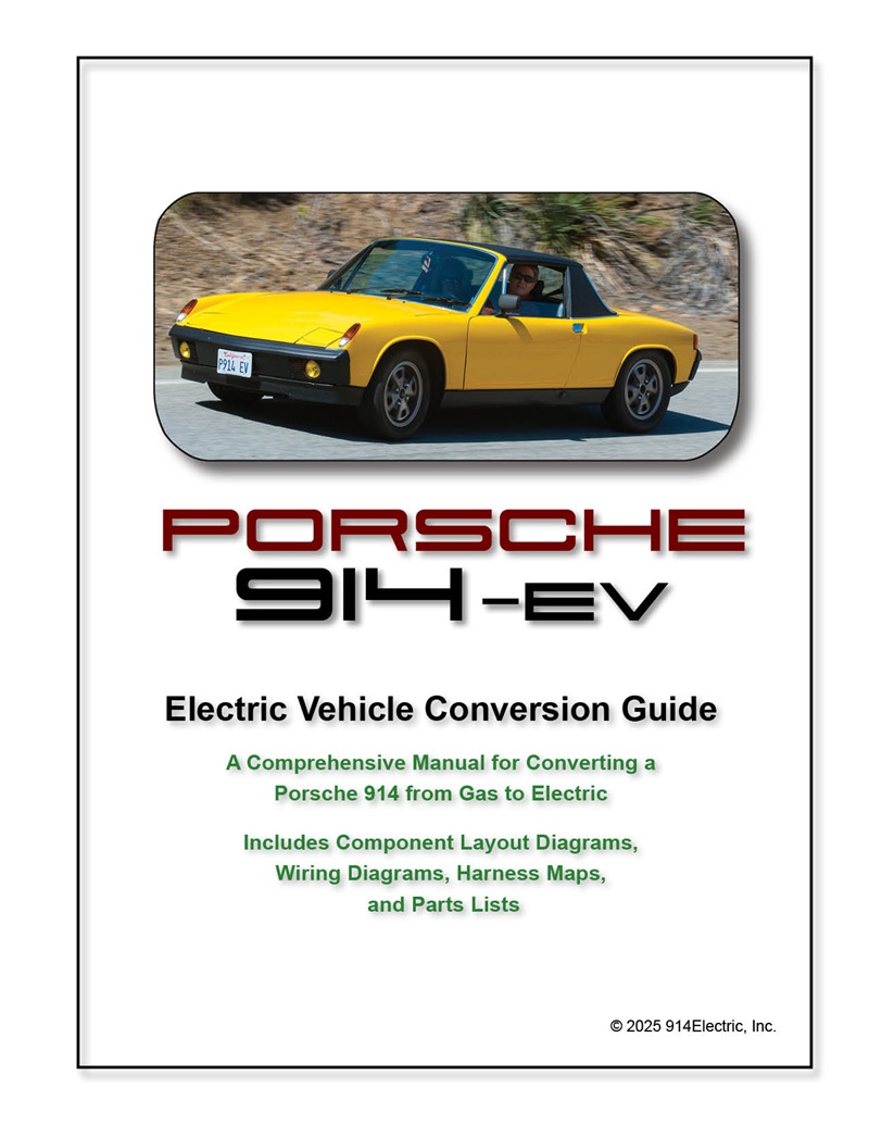 and index, battery management documentation, and a full parts inventory with links to online retailers. Everything required to plan and execute a 914EV conversion is presented in one place. Visit The 914Electric Online Store for the Conversion Guide, a full suite of component mounting hardware, a collection of large format diagrams, and other accessories. This is a professionally produced, physical manual intended for builders with mechanical and electrical competence, and prior automotive experience. • Physical printed manual, professionally produced • Based on real-world builds and documented practice • Overview and operational rundown of all EV systems • Comprehensive installation instructions for all EV components • Highly detailed schematics, harness map and layout diagrams • Extensive reference photos provided • Parts inventory provided with address to online retail links • Detailed programming instructions for HyPer 9 controller and MCU Add 25% more horsepower and 40% more torque over the stock 1.8L engine, while adding only 230 lbs to the curb weight. The Tesla 37kW battery pack provides 120 miles of blissful range. Cheers, Mark 914Electric, Inc. |