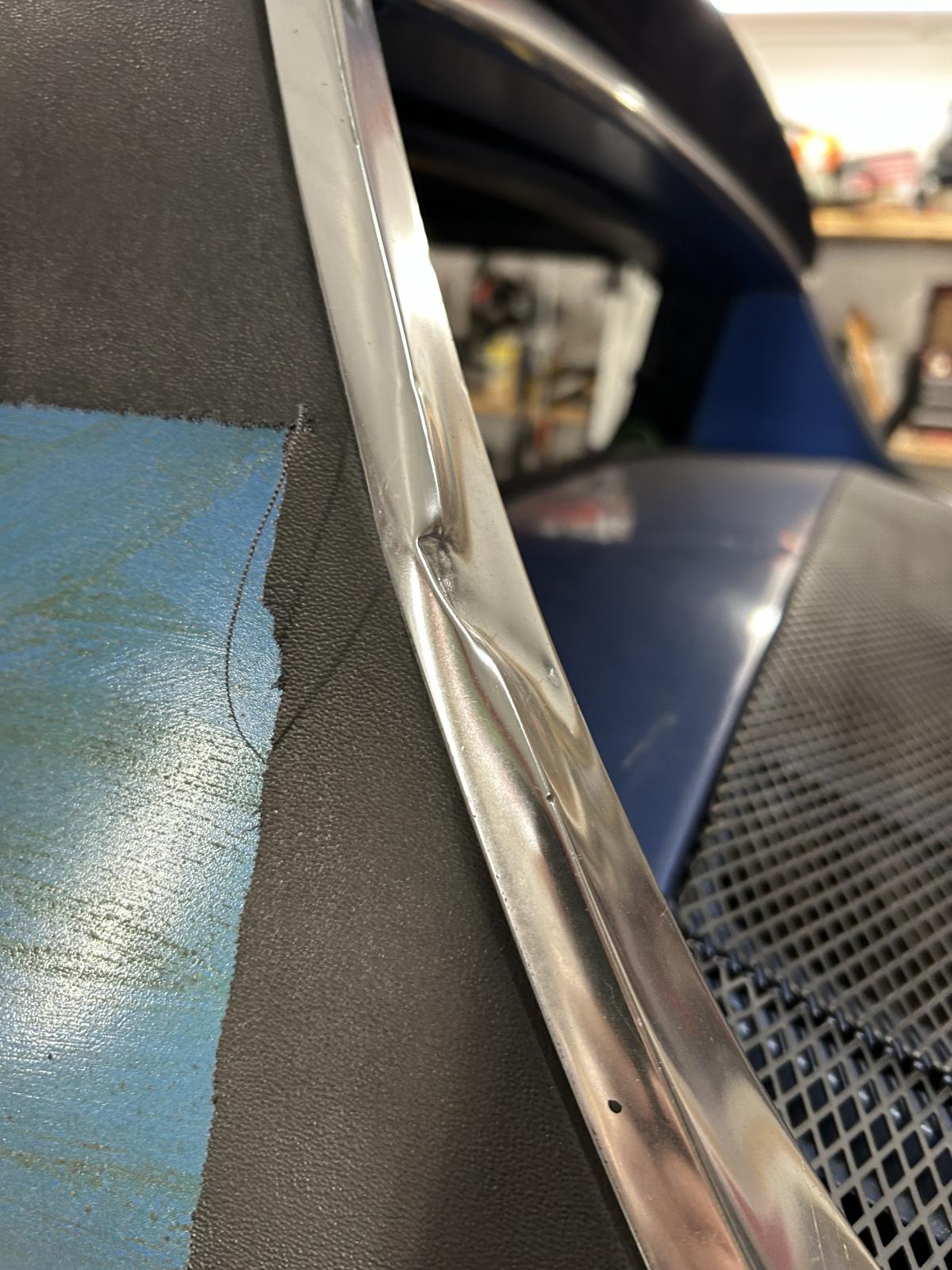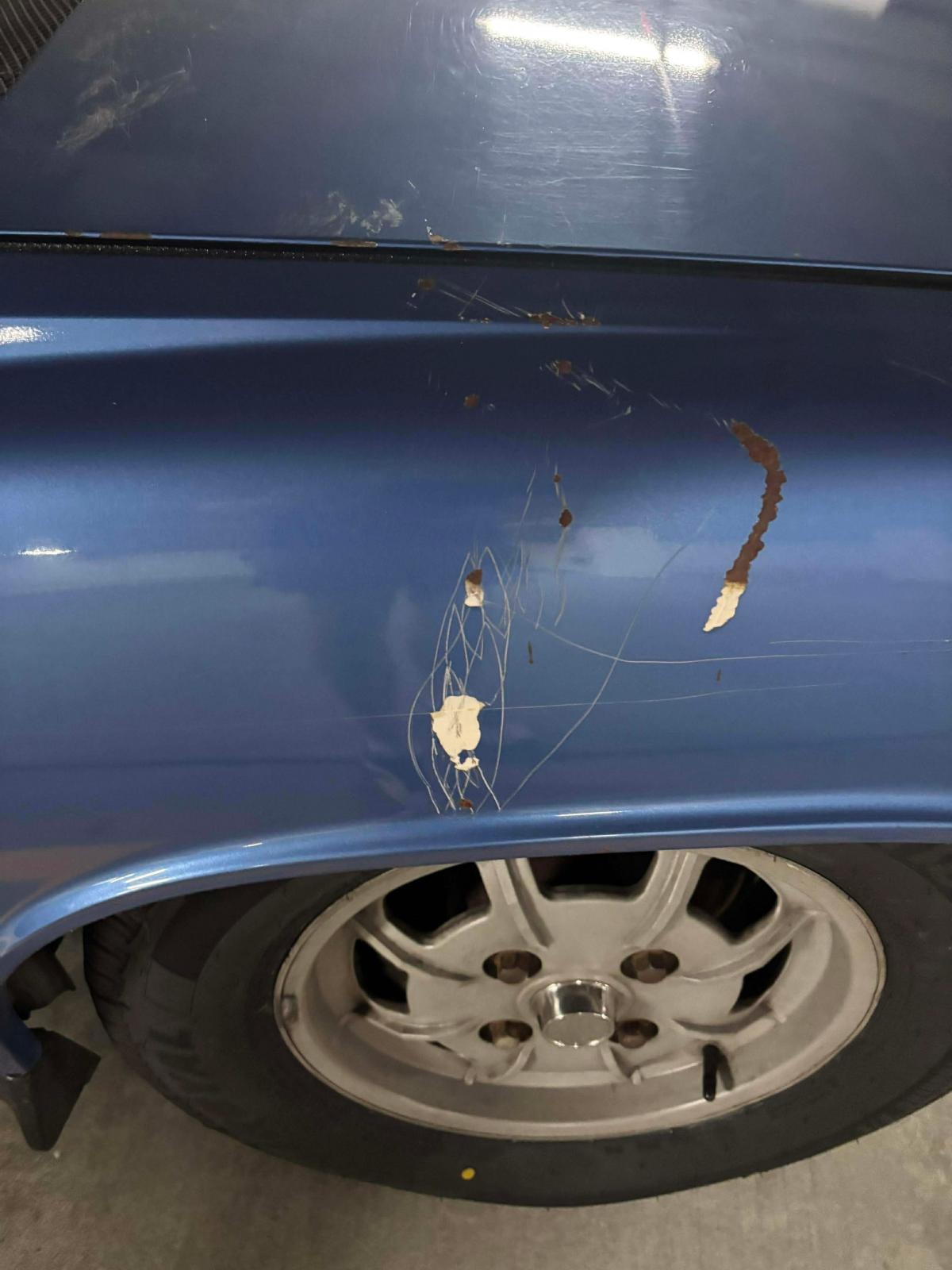 It was kept most of his life in parking garages. I think it had a fairly easy life until a girlfriend got upset, went into the trunk and pulled out a 9 iron iron and proceeded to break out the windshield, the rear glass in both the passenger and driver’s windows. Then she beat the car with the club and tore up most of the chrome. She put a couple of nice dents in the car and then scratched the 914. So now I’m gonna try and do a little bit of a sympathetic restoration and get it back on the road! |