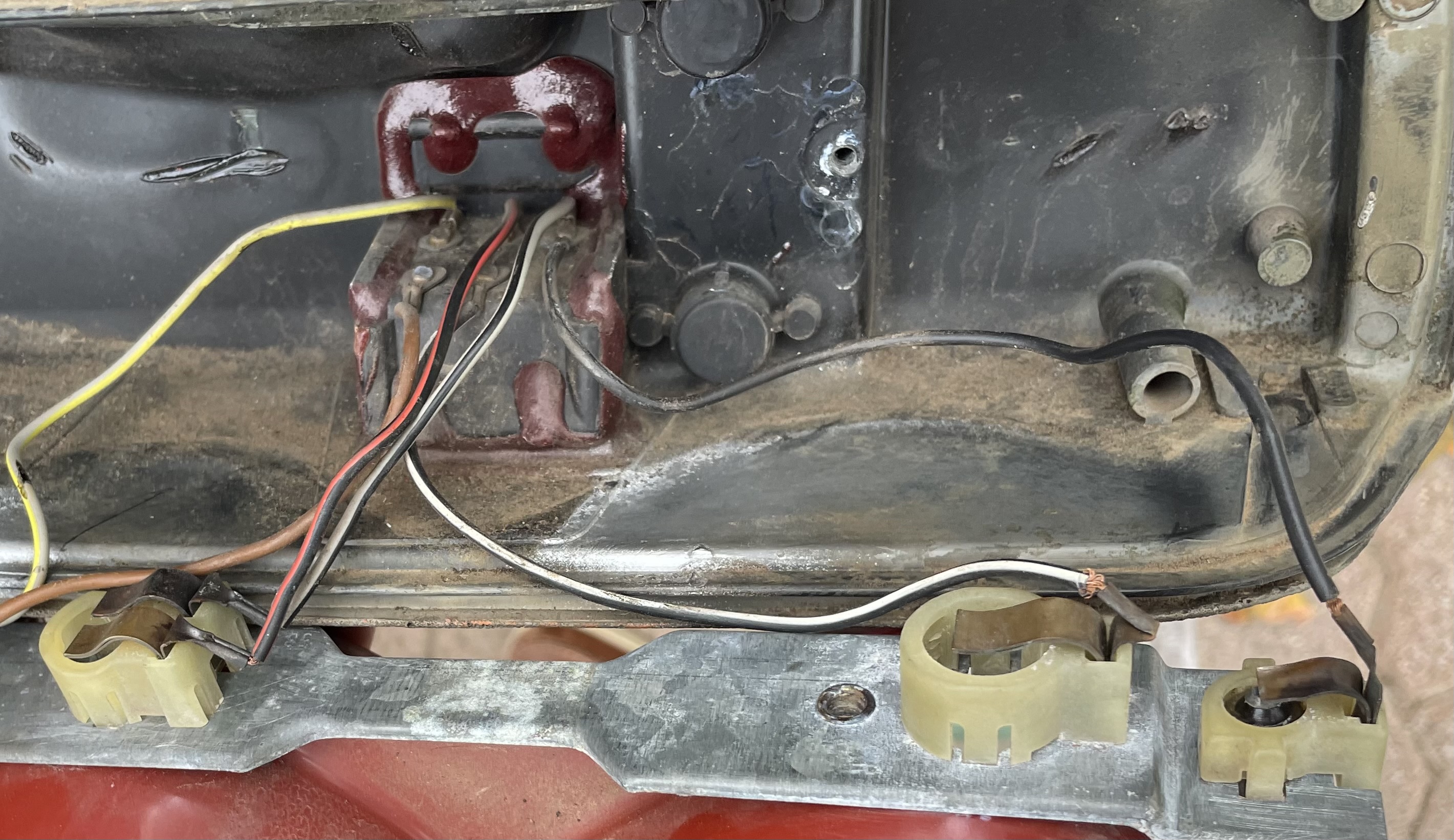 You may have wired the tail lights wires to the brake light terminals on the tail lights. I’m a little confused by that statement… i did however double check the placement of wires where they plug in, under each housing (probably what you were talking about). In the following picture you can see an all black wire that’s going over to the outer most bulb fixture (small bulb parking light).. if you look closely from from it’s originating, you will see a GY/BK wire from the same spot that travels to one of the terminals at the brake light bulb fixture. So if that’s where the parking light is getting power the it stands to reason that the brake light is too. So I guess the answer is ‘yes’ the brake light comes on with the first pull of the light switch, the parking lights. Attached thumbnail(s) |